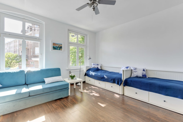 Sentralt plassert leilighet som ligger godt plassert: 5 min til sjøen og 7 min til Sopot sentrum. Den ligger i 2. etg. Separat toalett og bad. Plass for inntil 6 personer fordelt på to soverom + stue. Soverom 1 har dobbelt seng, soverom 2 har to enkeltsenger + en sovesofa.
